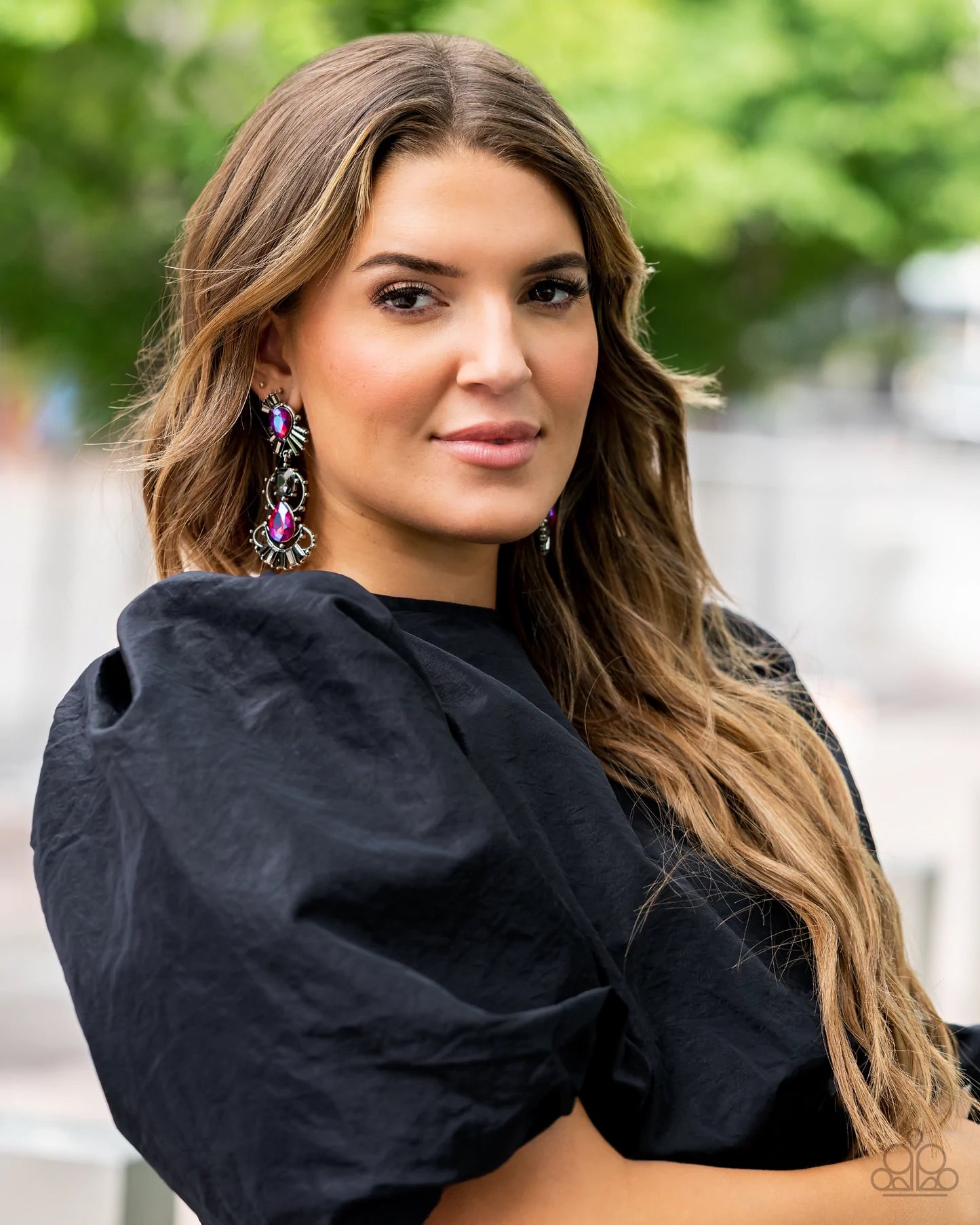 A cosmic collision of iridescent pink teardrop gems and a solitaire smoky emerald cut rhinestone haphazardly adorns studded silver frames. Dotted in round and emerald cut hematite rhinestone accents, the abstract frames stack into a stellar lure. Earring attaches to a standard post fitting. Due to its prismatic palette, color may vary.