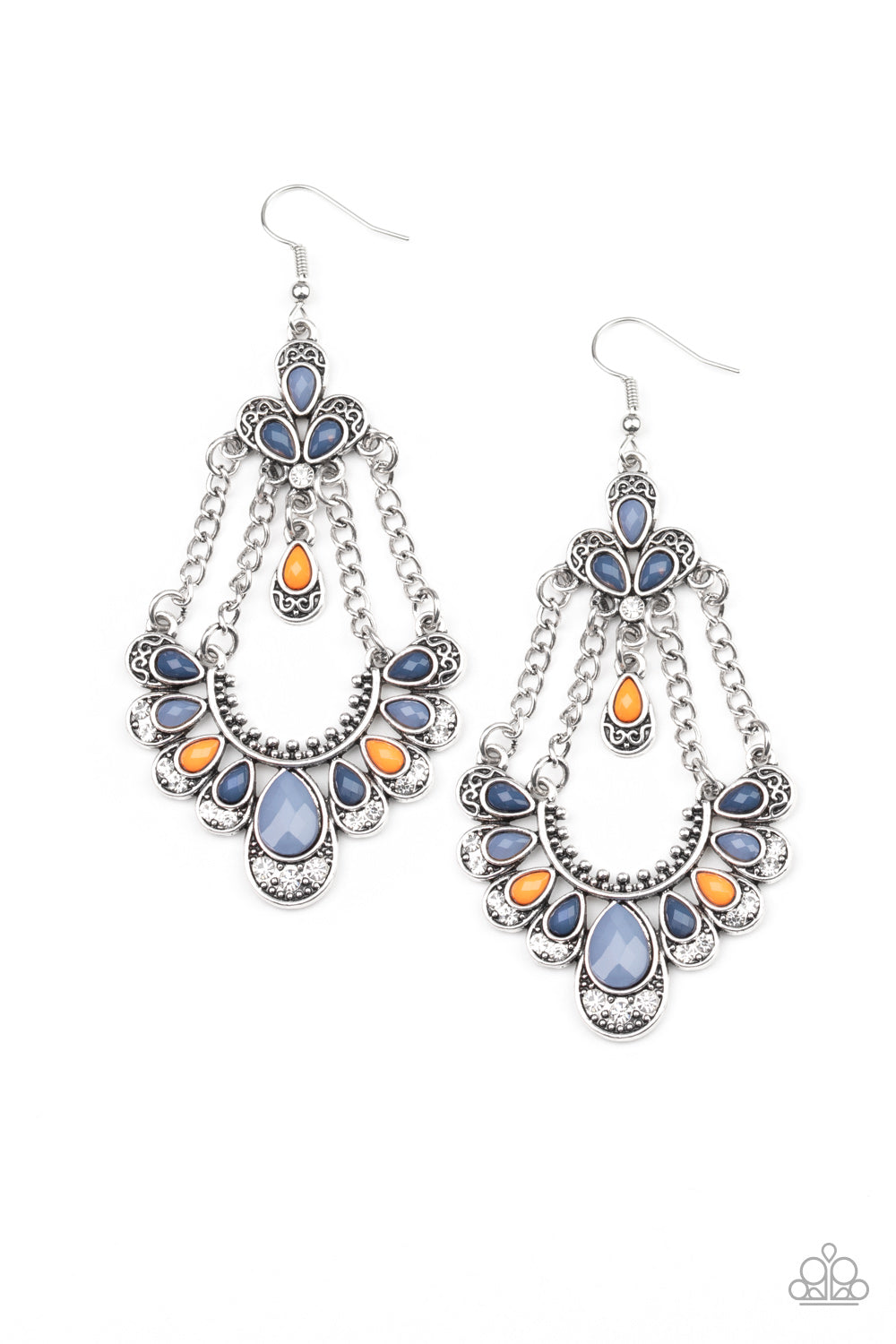 Suspended by silver chains, faceted blue and orange teardrop beads are pressed into decorative silver frames featuring silver filigree and glassy white rhinestones. The ornate frames coalesce into a whimsical frame. Earring attaches to a standard fishhook fitting.