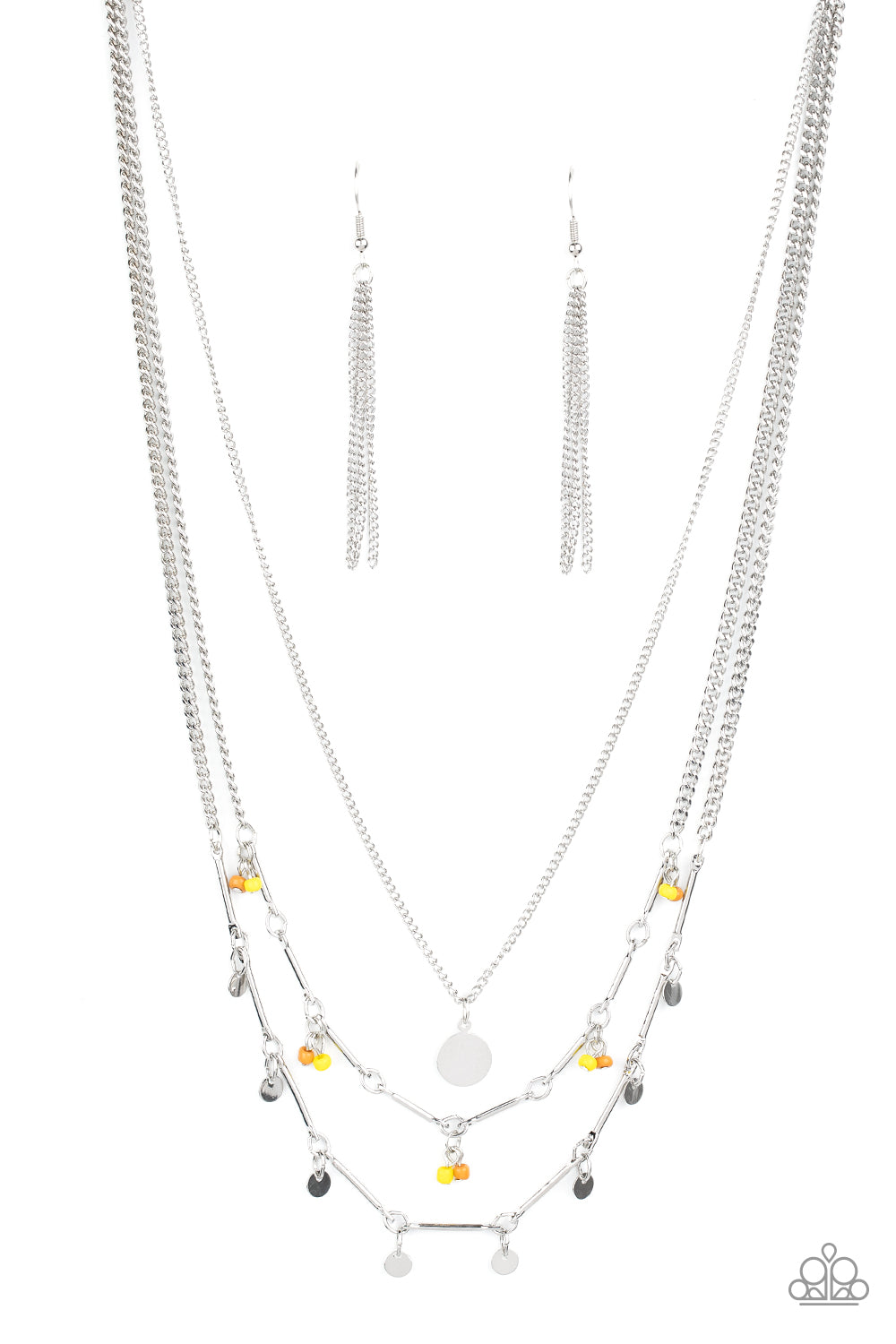 A silver disc is suspended above two mismatched silver chains featuring a mismatched array of silver bars, silver discs, and pairs of brown and yellow seed beads. The dainty display delicately layers below the collar, creating a colorful fringe. Features an adjustable clasp closure.