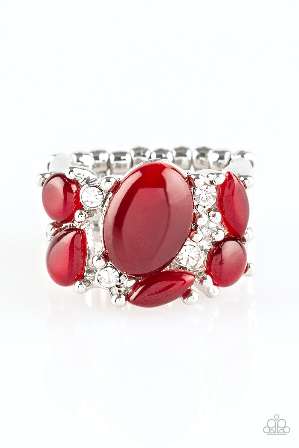 Glittery white rhinestones and glowing red moonstones are sprinkled across the finger, coalescing into a whimsical band. Features a stretchy band for a flexible fit.