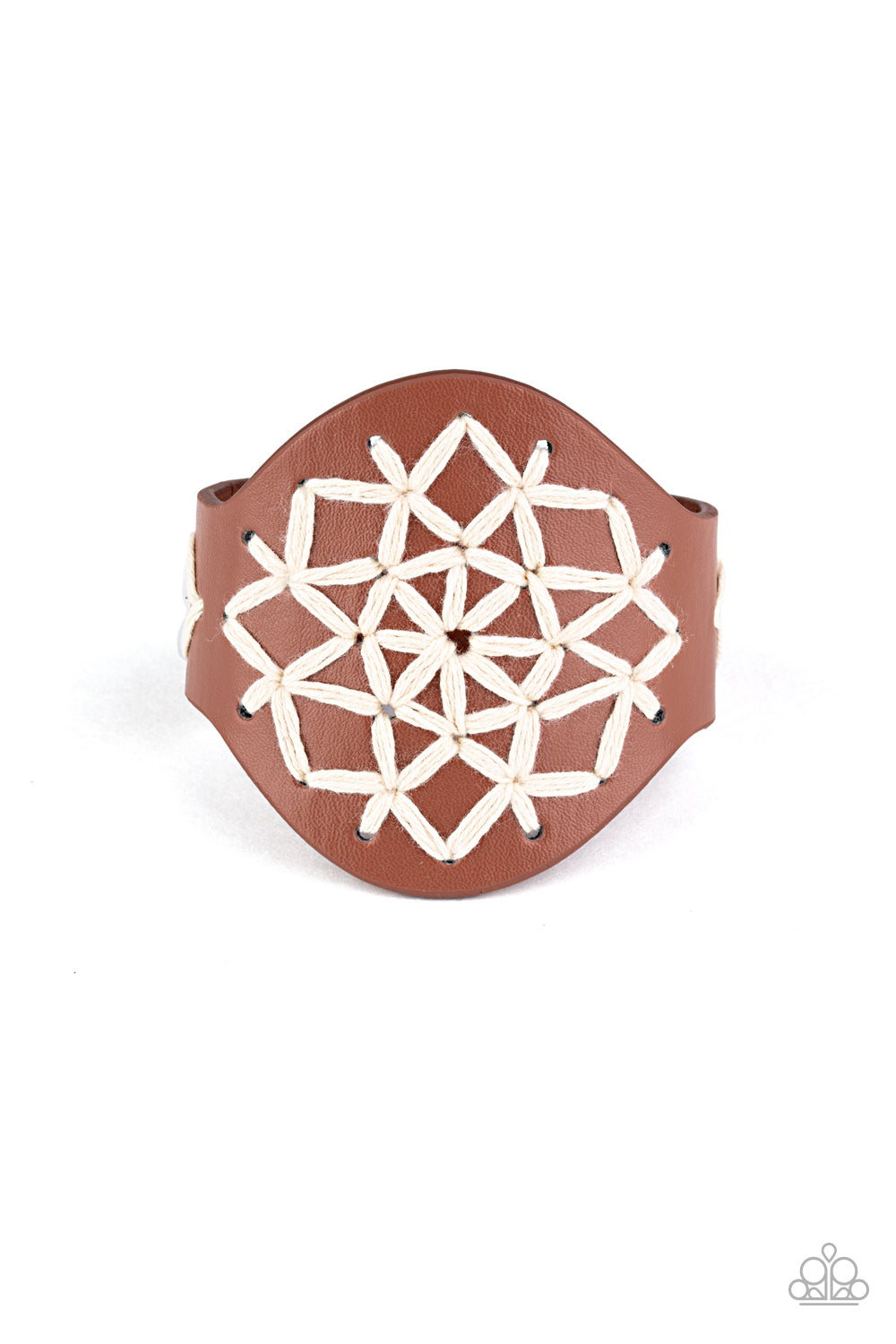 Twine-like cording is stitched across the front of a rustic brown leather bracelet, creating an artisan inspired centerpiece around the wrist. Features an adjustable snap closure.
