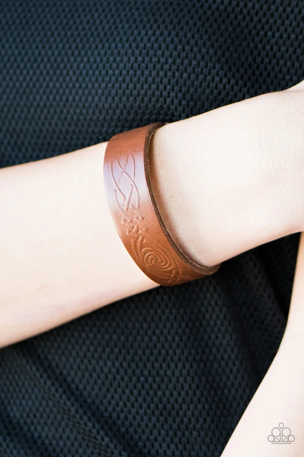 Embossed in a tribal inspired pattern, a strip of brown leather wraps around the wrist in an urban fashion. Features an adjustable snap closure.Sold as one individual bracelet