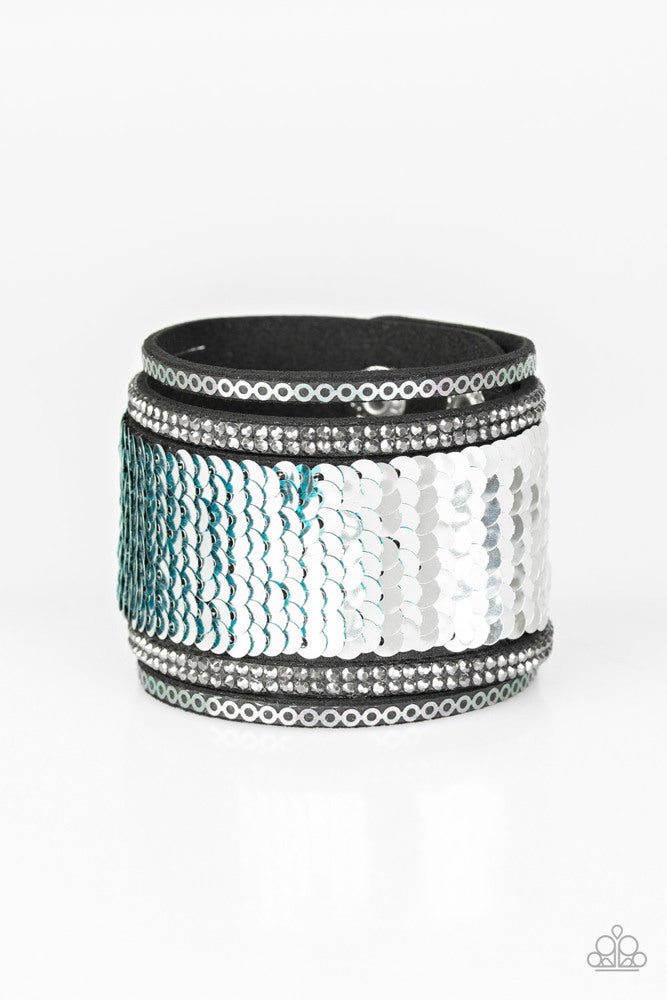 Infused with strands of smoky hematite rhinestones and dainty metallic accents, row after row of shimmery sequins are stitched across the front of a spliced black suede band. Bracelet features reversible sequins that change from silver to blue. Features an adjustable snap closure.
