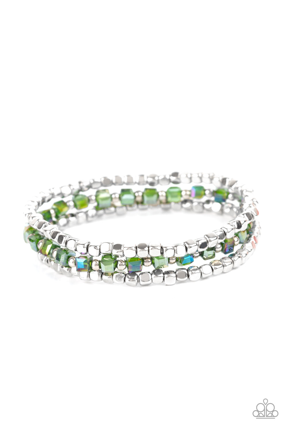 Separated by dainty silver beads, a sparkly strand of square green crystal-like beads joins a pair of silver cube beaded stretchy bands around the wrist for a colorful look.
