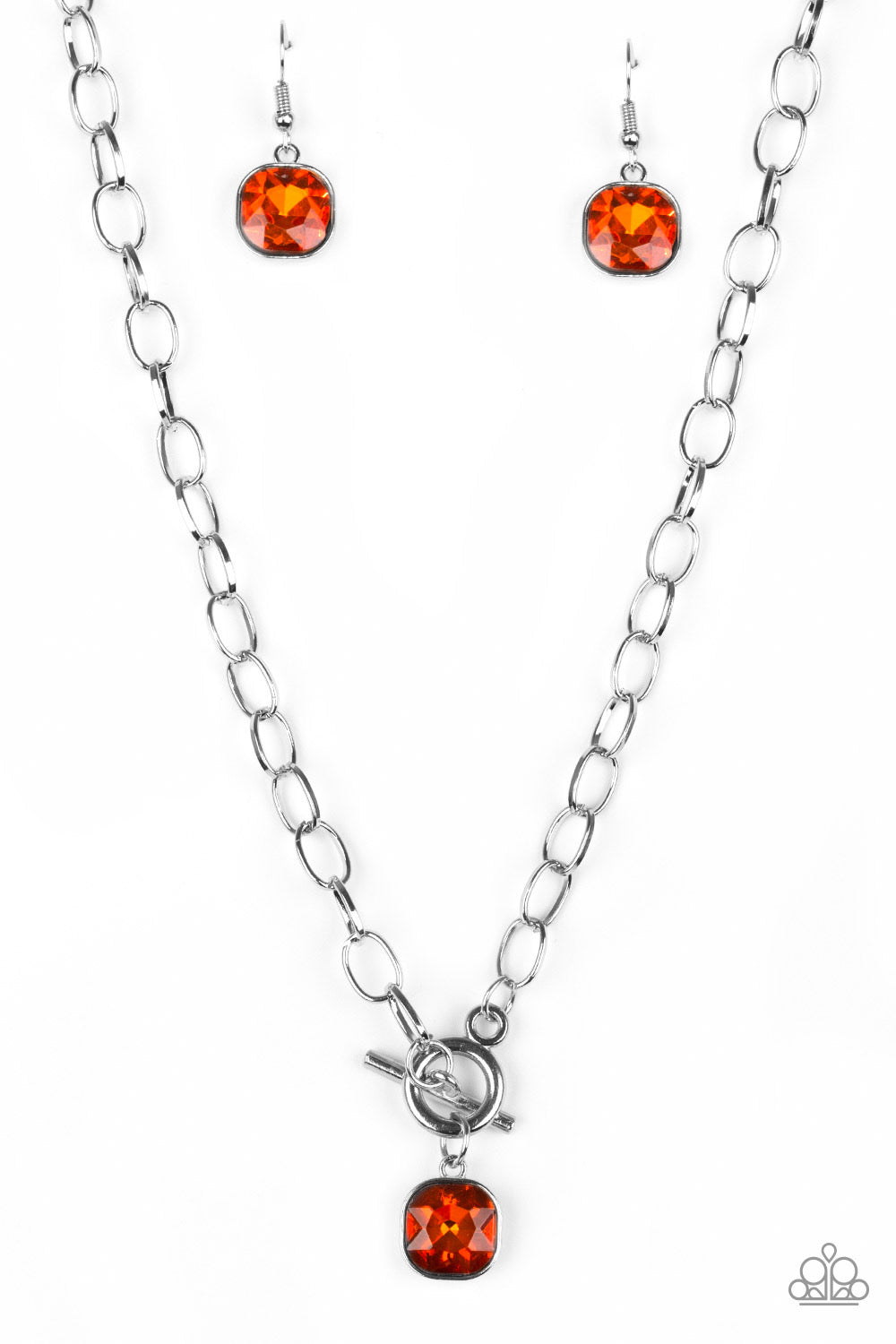 Pressed into a sleek silver frame, a dramatic orange gem swings from the bottom of a glistening silver chain below the collar for a chic look. Features a toggle closure.