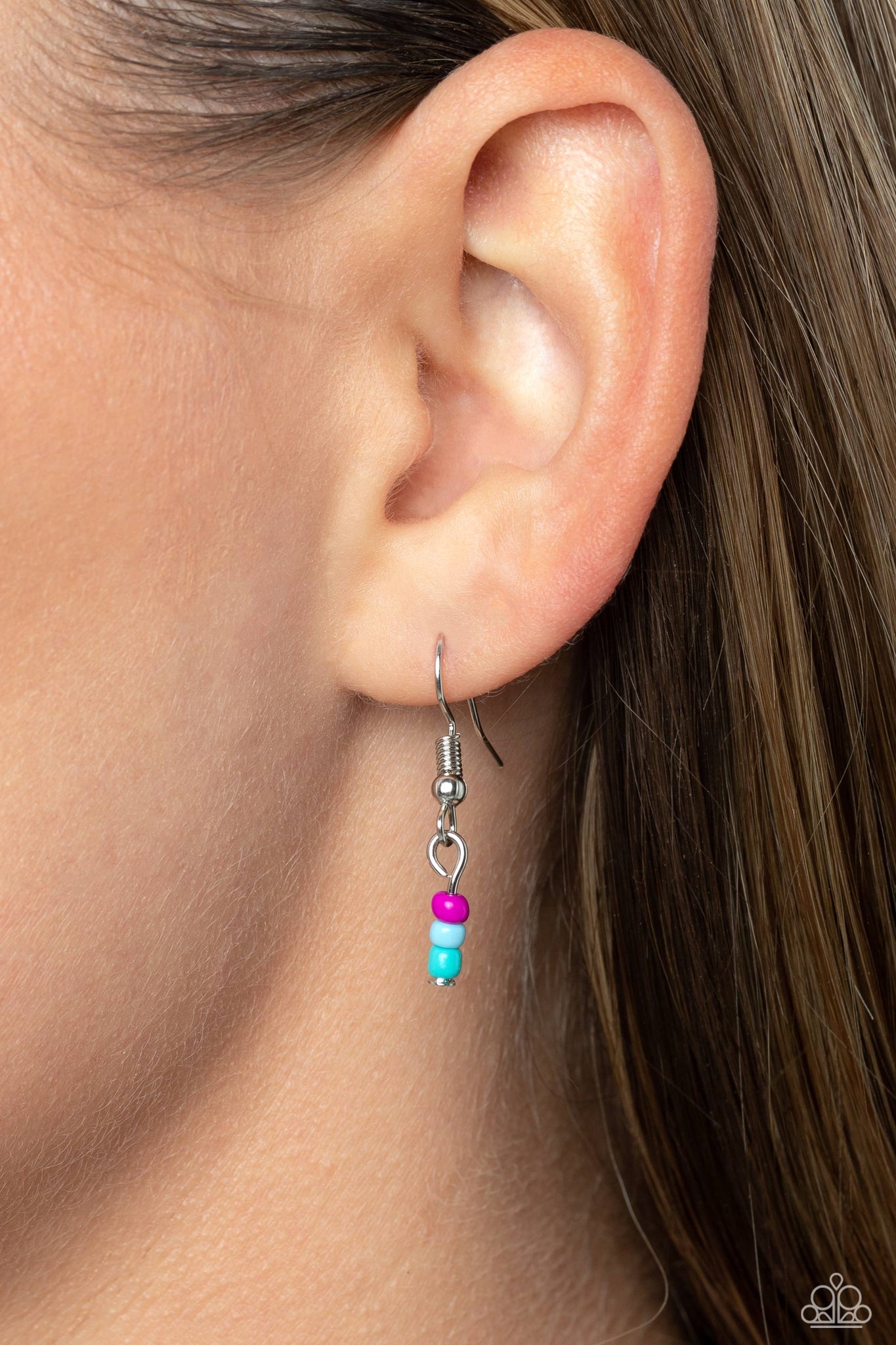 Colorful seed beads featuring various shades of blue are threaded along a wire, falling along the collar in a capricious pattern. A delicate silver ball chain featuring a dangling silver heart pendant, layers together with the colorful beads for a sassy and sweet, combo. Features an adjustable clasp closure.