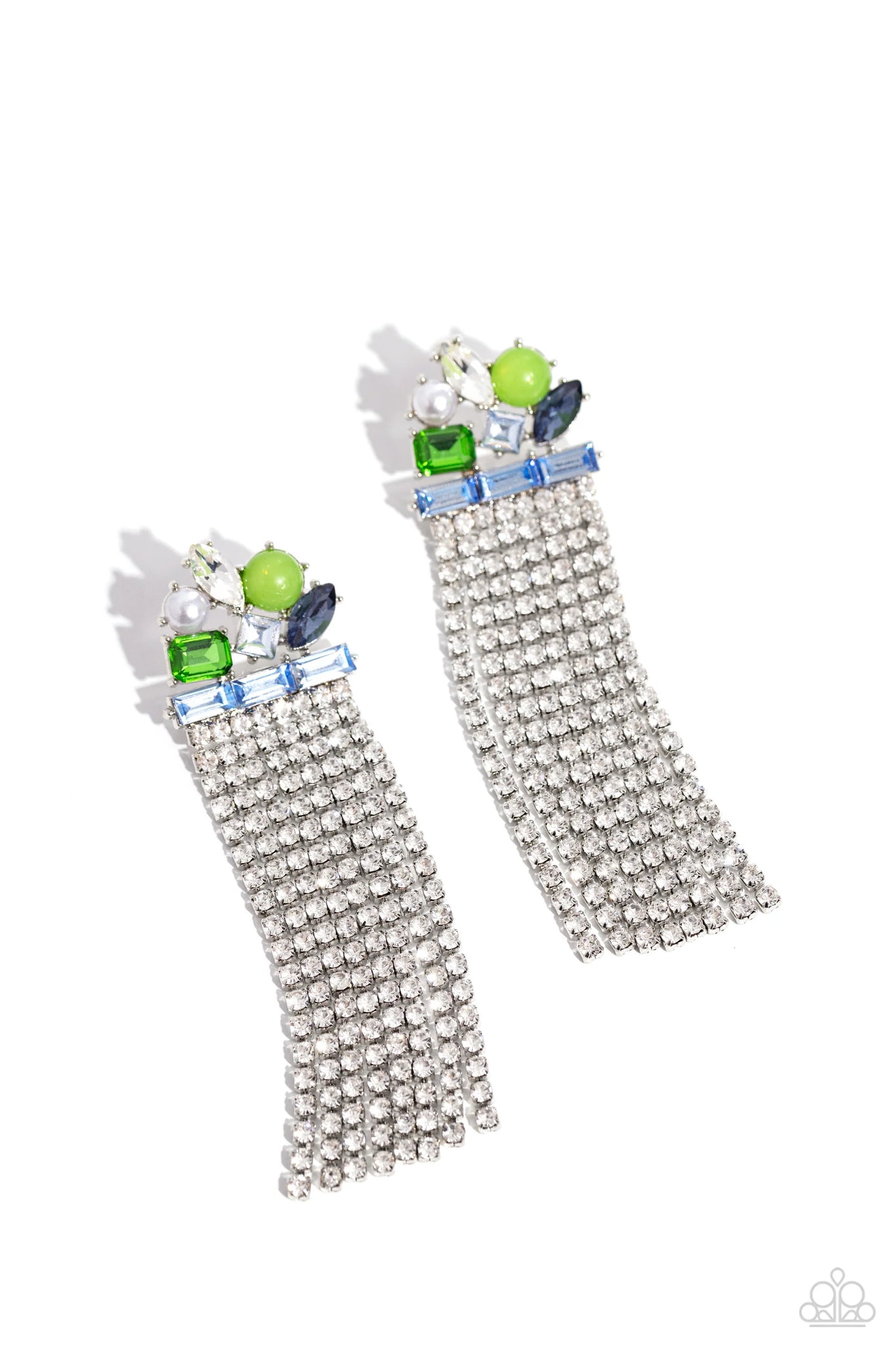 Featuring pronged silver fittings, a trio of blue emerald-cut gems lay across the ear in a horizontal manner. Various green, white, and blue gems and a milky green bead and white pearl haphazardly cluster up the ear from the horizontal layer for additional eye-catching detail. Strands of white rhinestones in sleek silver square fittings cascade from the emerald-cut layer, creating freefalling glitzy movement. Earring attaches to a standard post fitting.