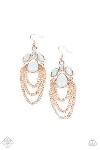 Rows of shimmery rose gold chain drape from the bottom of a stacked rose gold frame floating with a collection of opalescent white beads. Earring attaches to a standard fishhook fitting.