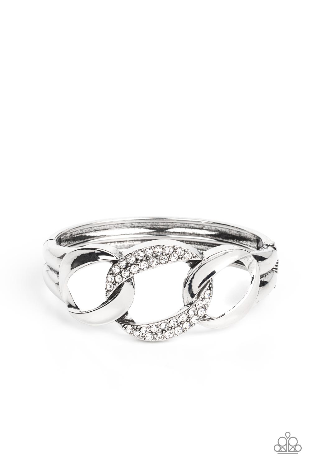 A trio of rounded square silver links, featuring a hammered texture, interlock into an unapologetic display. The centermost link is dotted with glassy rhinestones, creating a sparkly fashion around the wrist. Features a hinged closure.