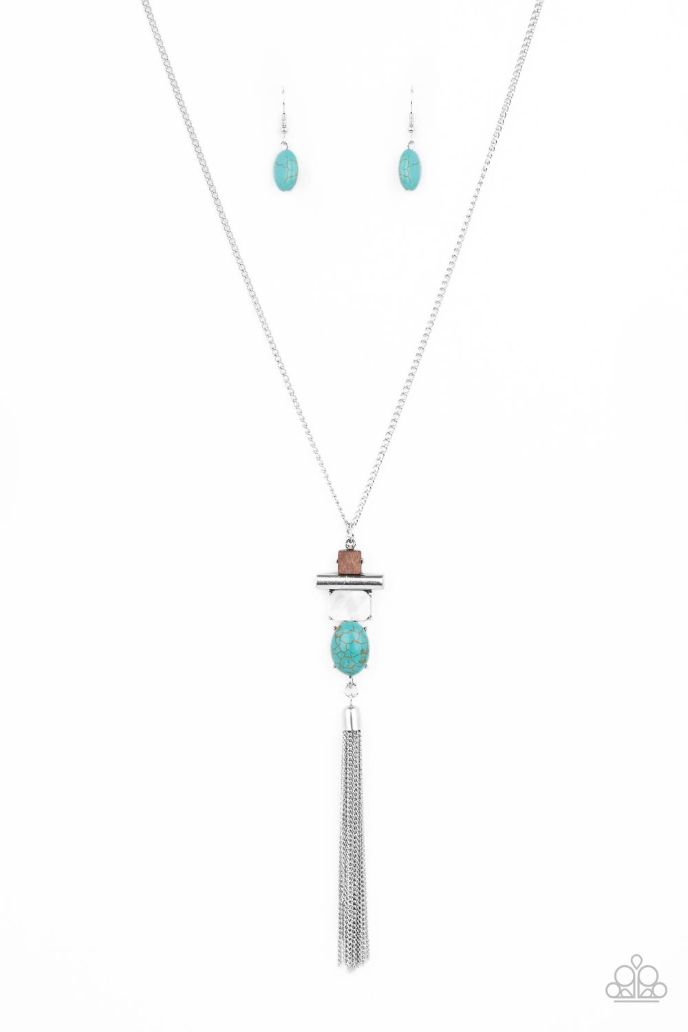 A square wooden frame, silver rod, piece of white shell, and oval turquoise stone stack into a seasonal pendant at the bottom of a lengthened silver chain. A shimmery silver chain tassel swings from the frame, adding playful movement to the earthy display. Features an adjustable clasp closure.