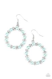Pairs of dainty white rhinestones and solitaire blue pearls are encrusted along the front of a shimmery silver hoop for a refined look. Earring attaches to a standard fish hook fitting