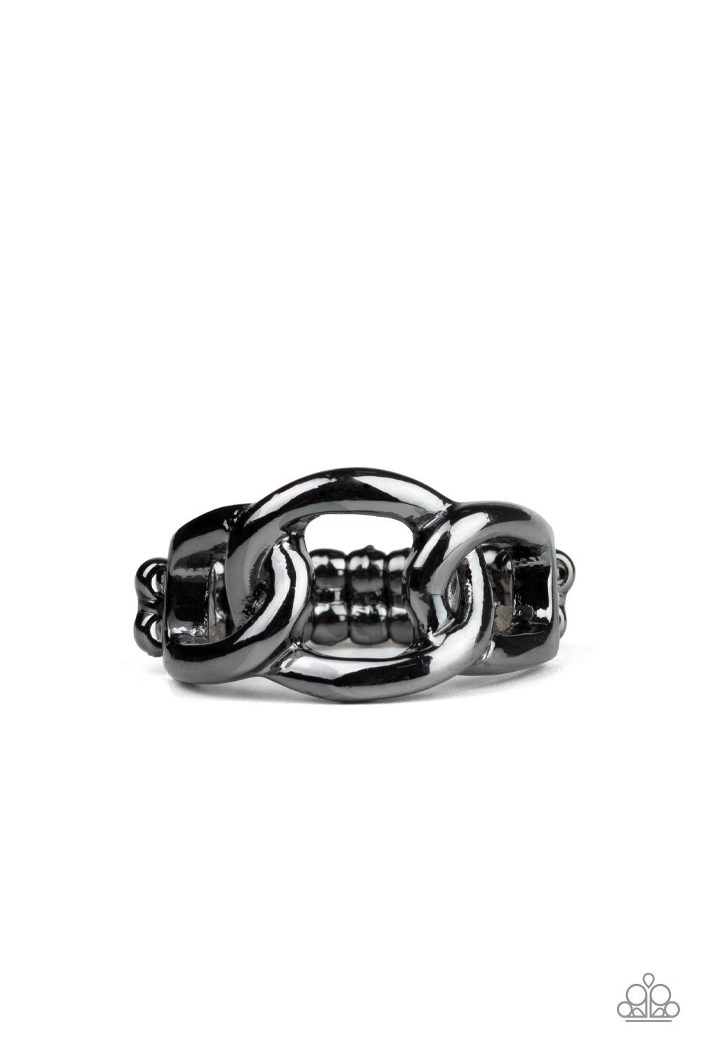 Glistening gunmetal links connect across the finger, creating an edgy band. Features a dainty stretchy band for a flexible fit.