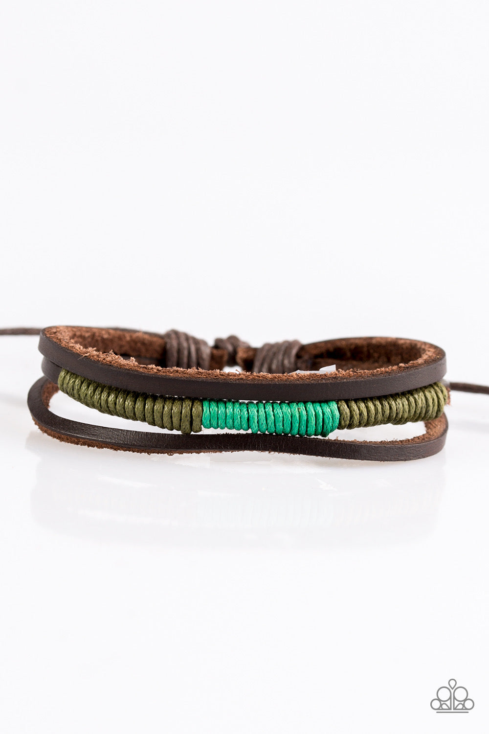 Three rustic leather bands layer across the wrist. Earthy green twine knots around the center strand for a colorful urban finish. Features an adjustable sliding knot closure.